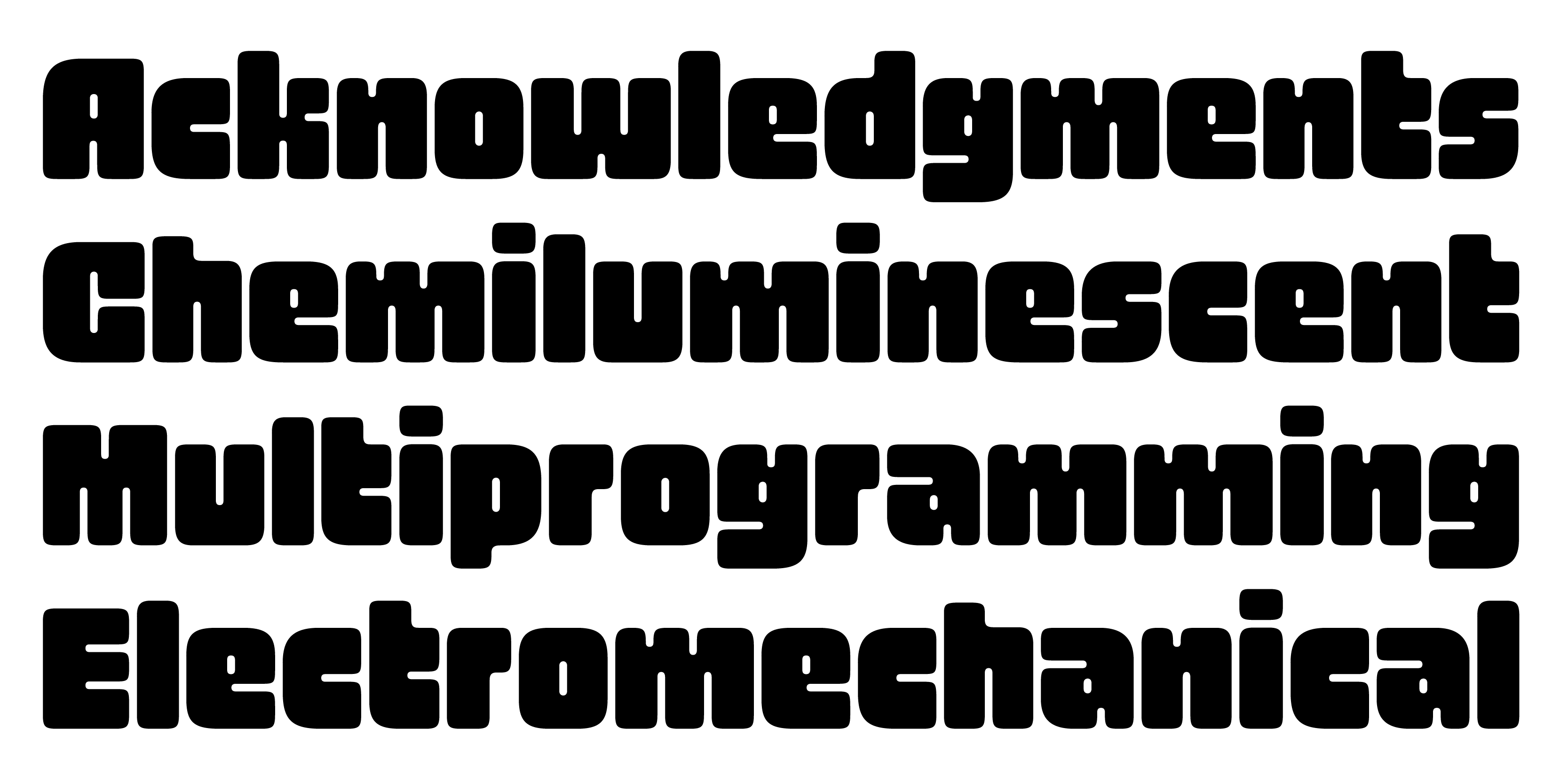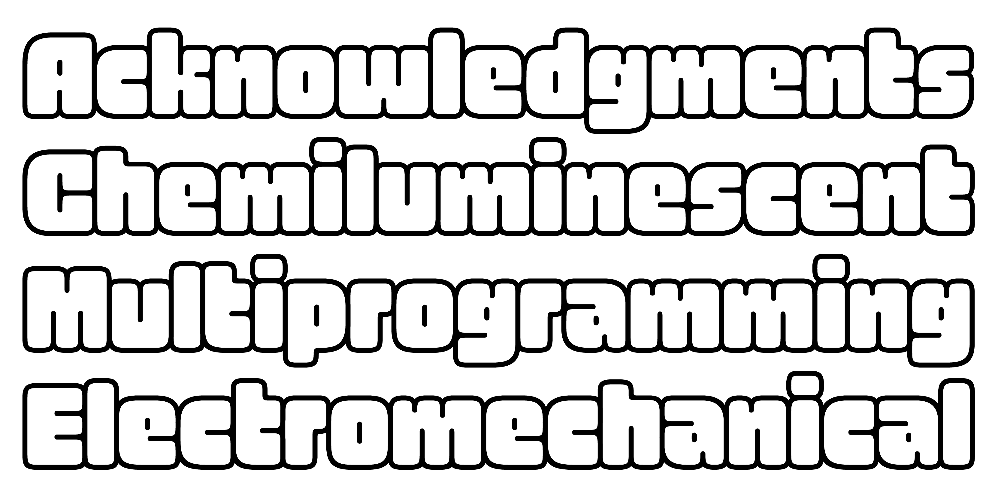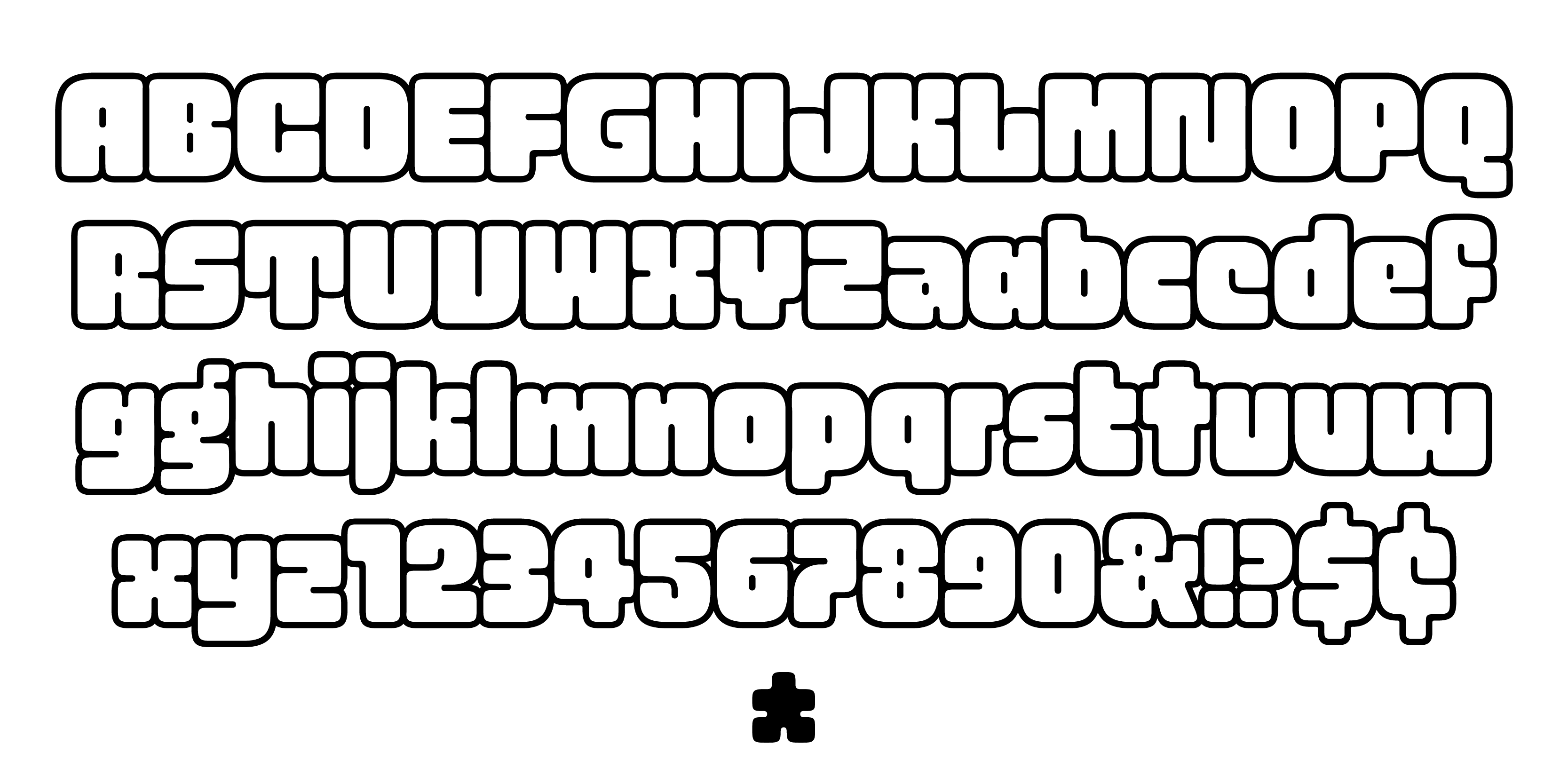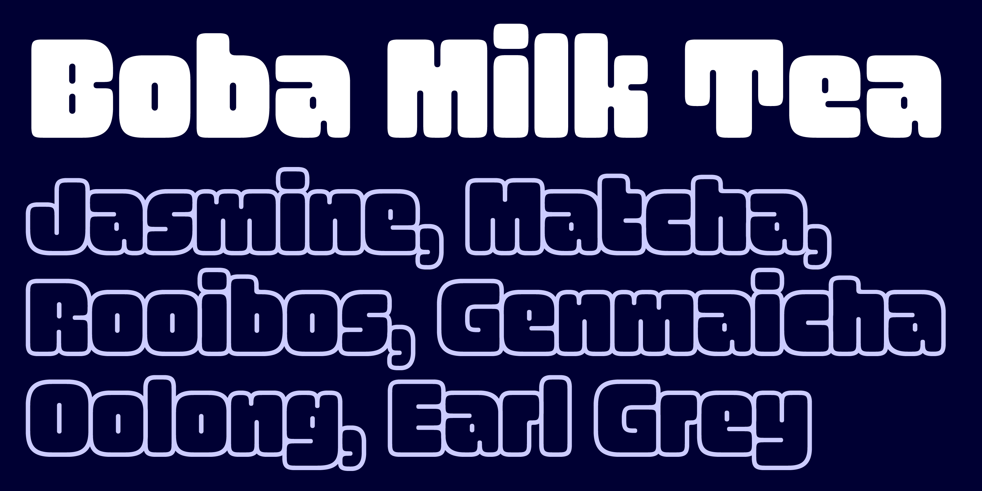 Boiga is a display type family by Kel Troughton. It’s soft edges, bulky joins and overlapping outlines make it a great headline style for any design looking to add some friendly quirk. The family was drawn to work as an outline with uniform overlaps but also contains the filled in letters that work as a reverse of the outlines. Boiga’s shapes come from two very different sources. The first is bold signage and packaging from Amayoko shopping district in Tokyo, ultra-bold, often outlined type in bright colors. The second source is 1990s new york rooftop graffiti, specifically two letter throw ups that are bold enough to read from a moving train. Both sources rely on an often friendly and cute demeanor in a sometimes anthropomorphic letter. The name Boiga references two subjects: 1: A snake with sectional body markings that is kinda cute. 2: A goofy way to say the word Burger.