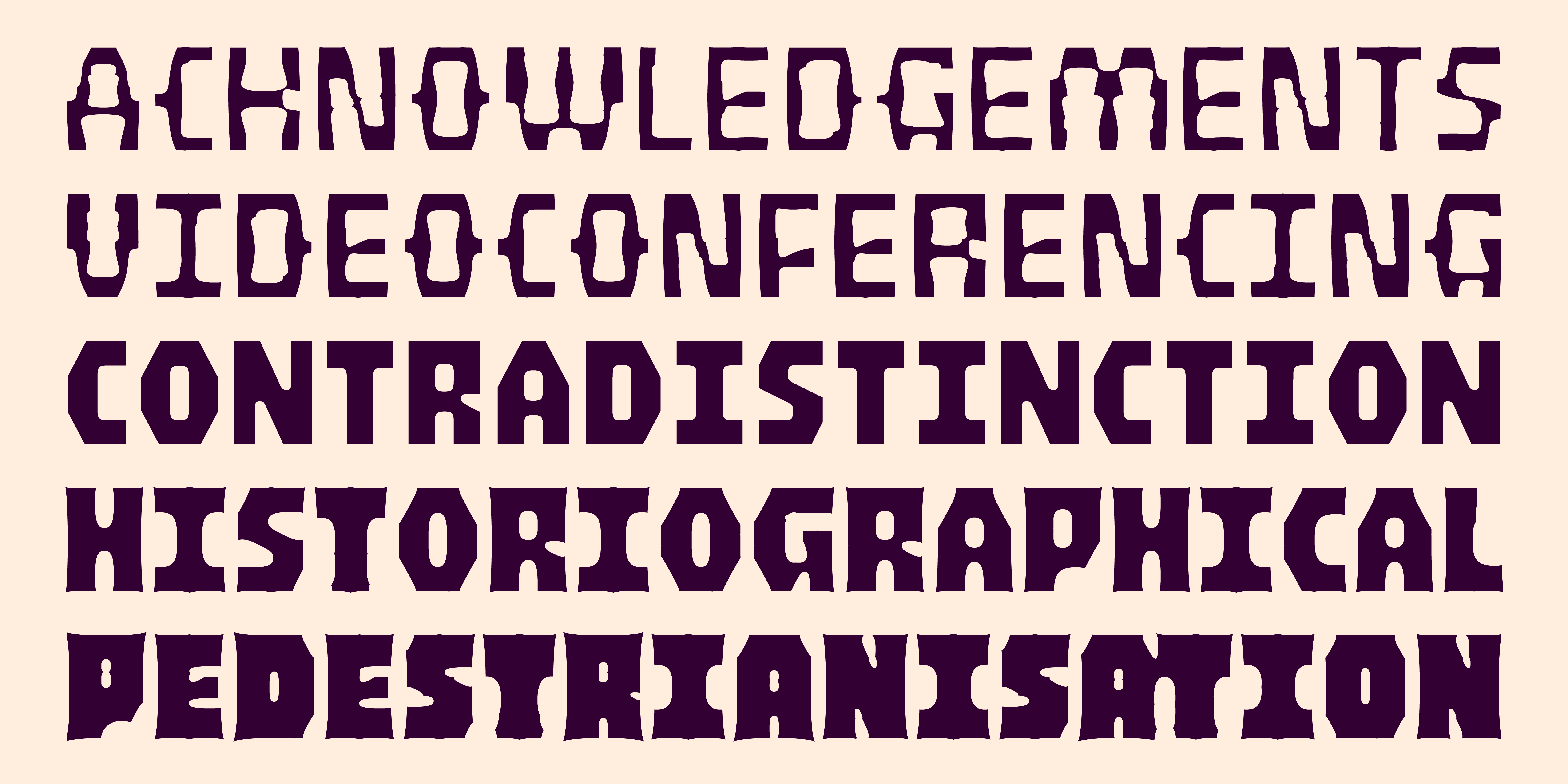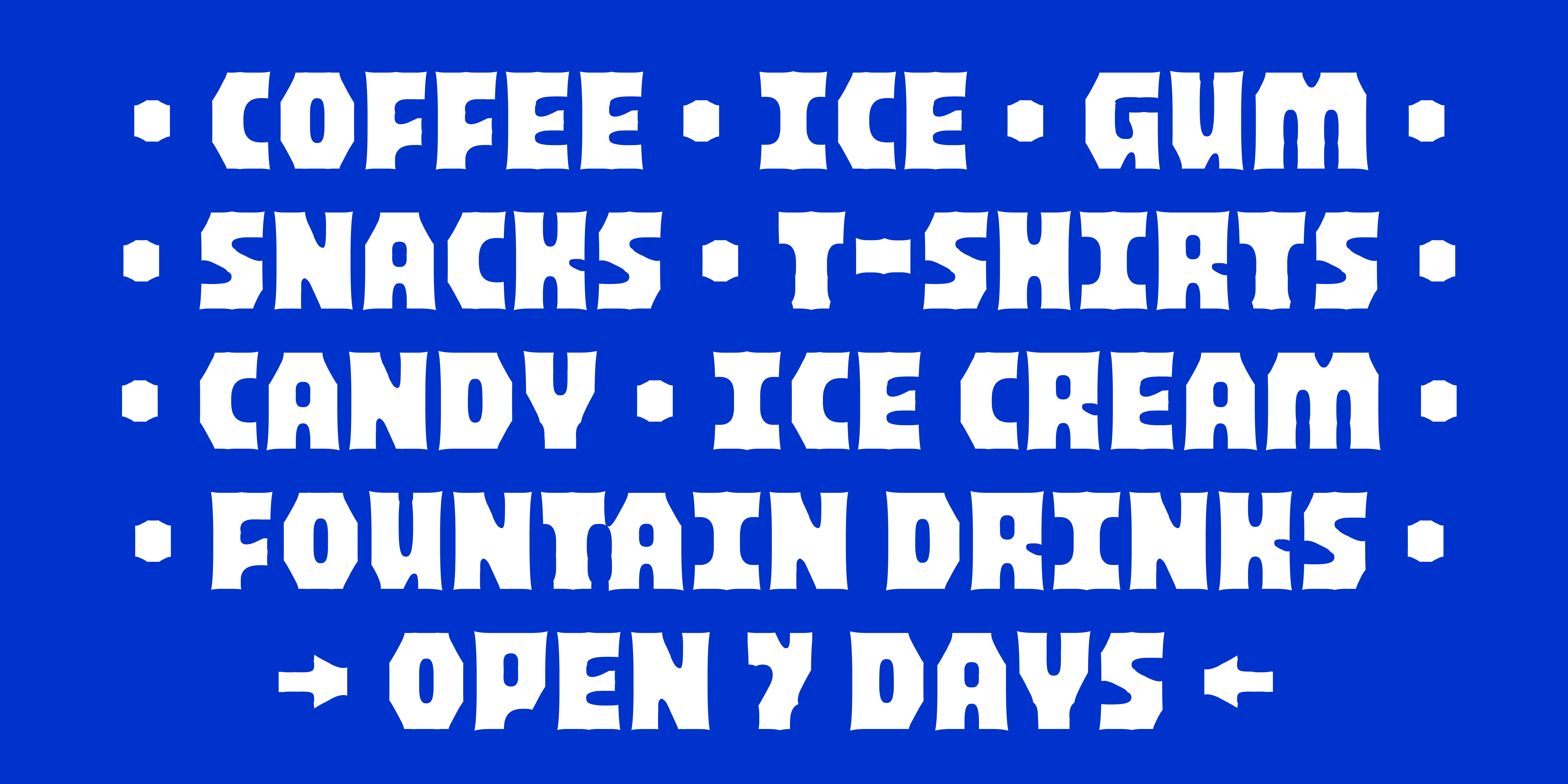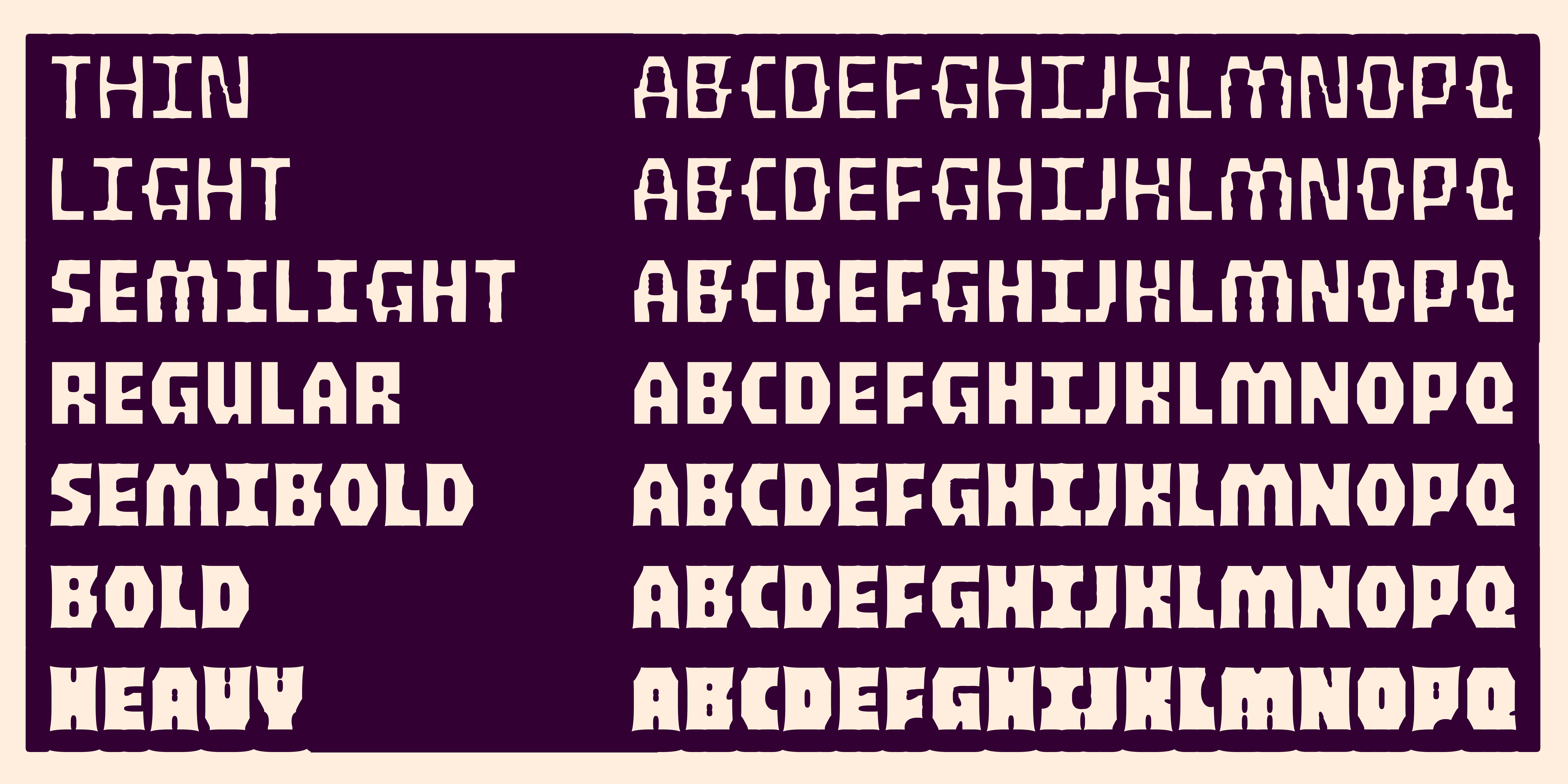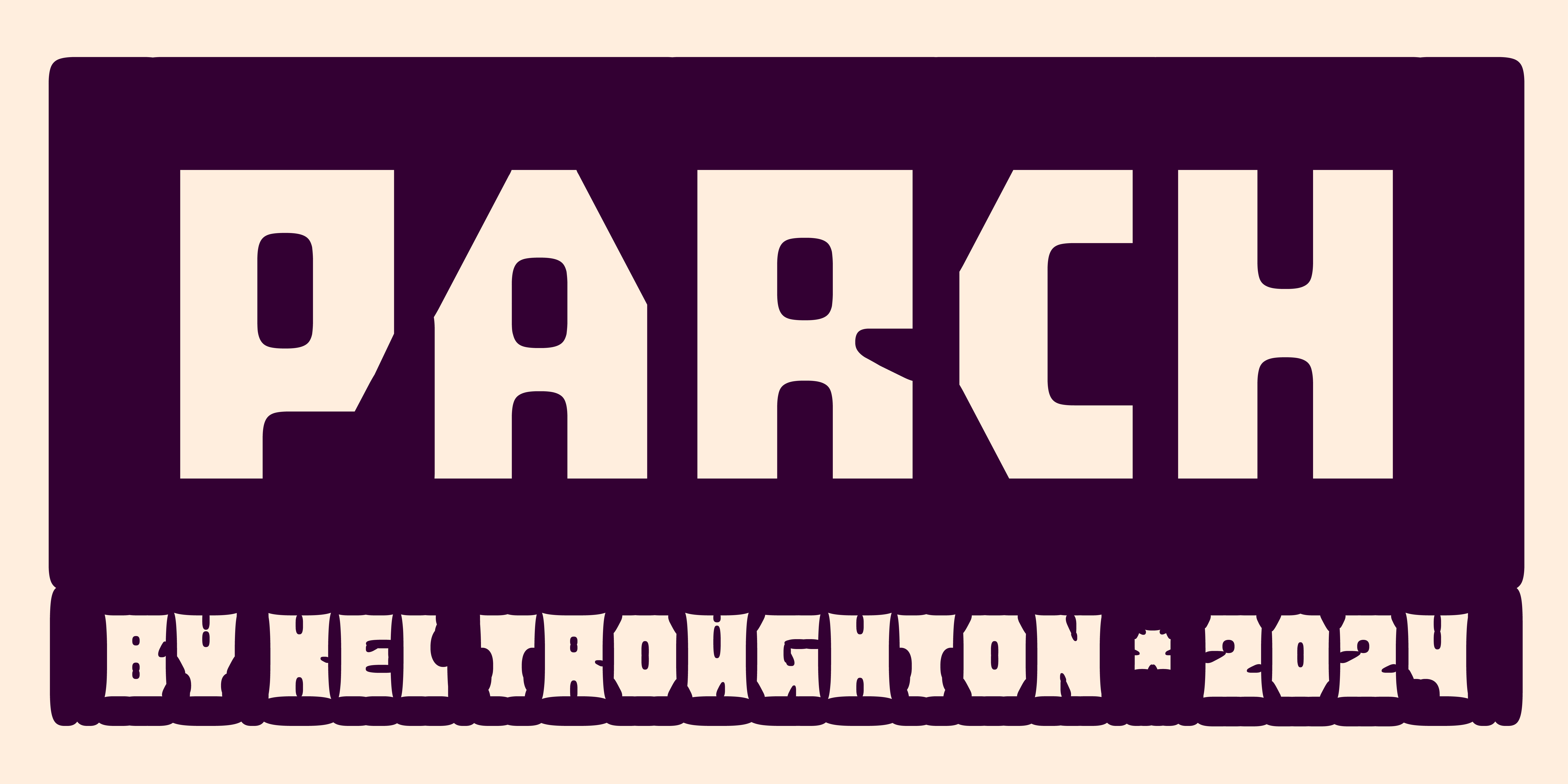 Thin Light SemiLight Regular SemiBold Bold HeavyParch is a variable type family designed by Kel Troughton, based on the deterioration of vinyl signs in the California sunshine. This type family was created in reverse, leaving behind letterforms in the negative space. Parch is an unicase and uniwidth design made with a few simple building blocks. These building blocks give Parch a distinct and rigid feel in the regular weight, and allows the variable font to morph as those blocks change shape. It was designed to use in reverse with a decaying variable axis, with the lightest and heaviest weights showing the most deterioration. The full family also includes the static .otf files in both positive and negative styles for ease of use. Though it comes from the world of signage, we think this display family would be great for you next spooky, mechanical, expressive layouts.