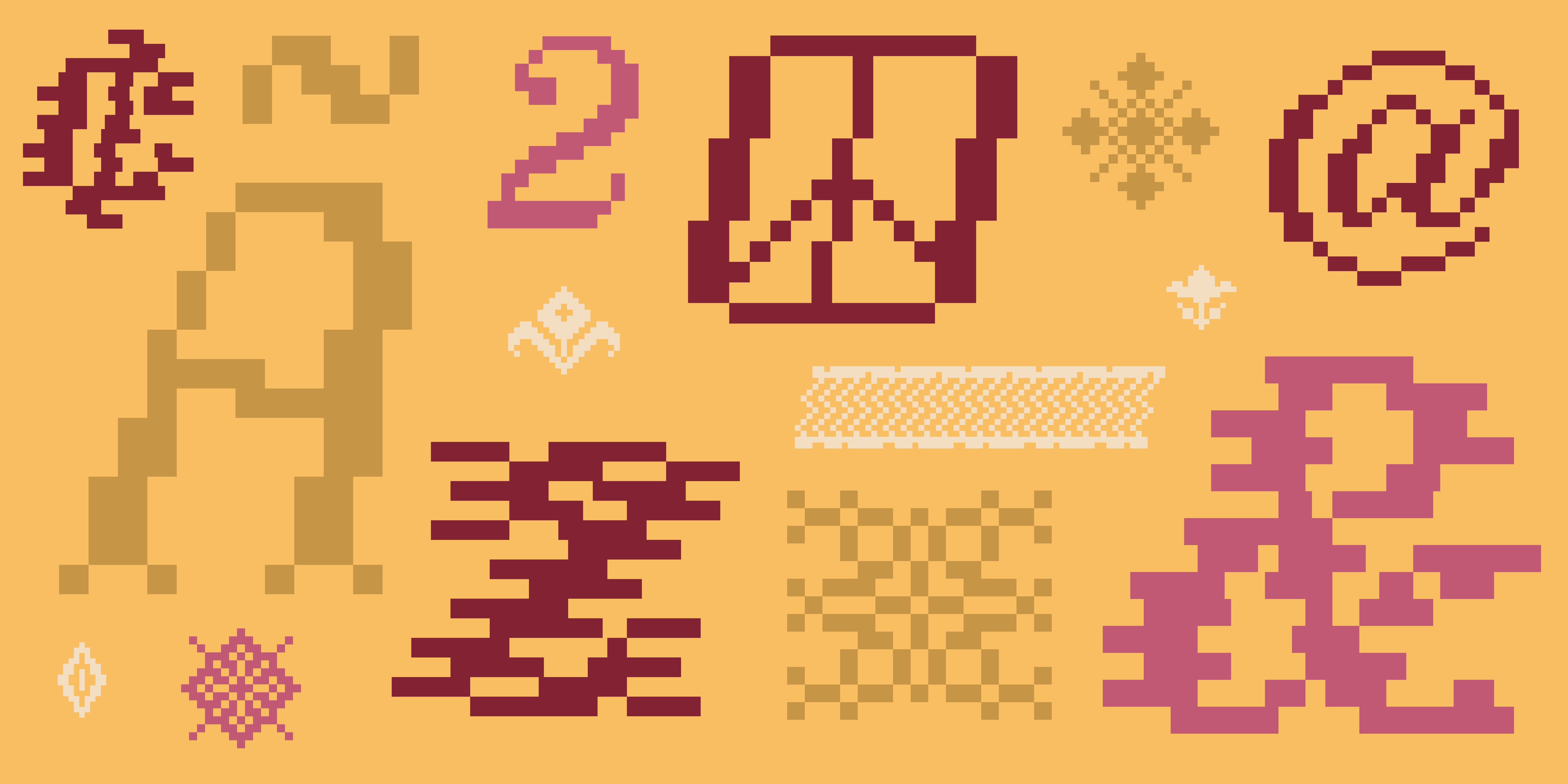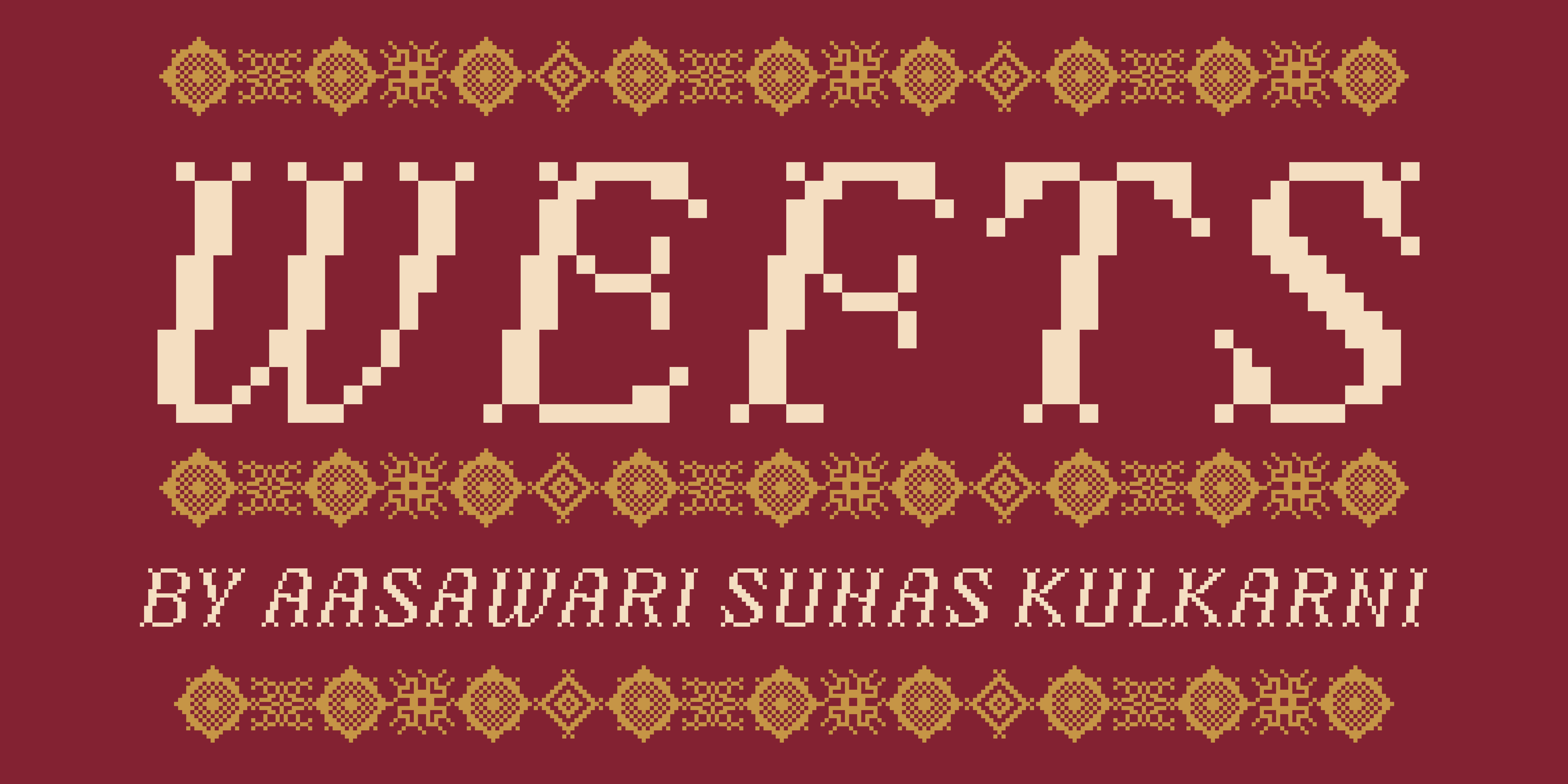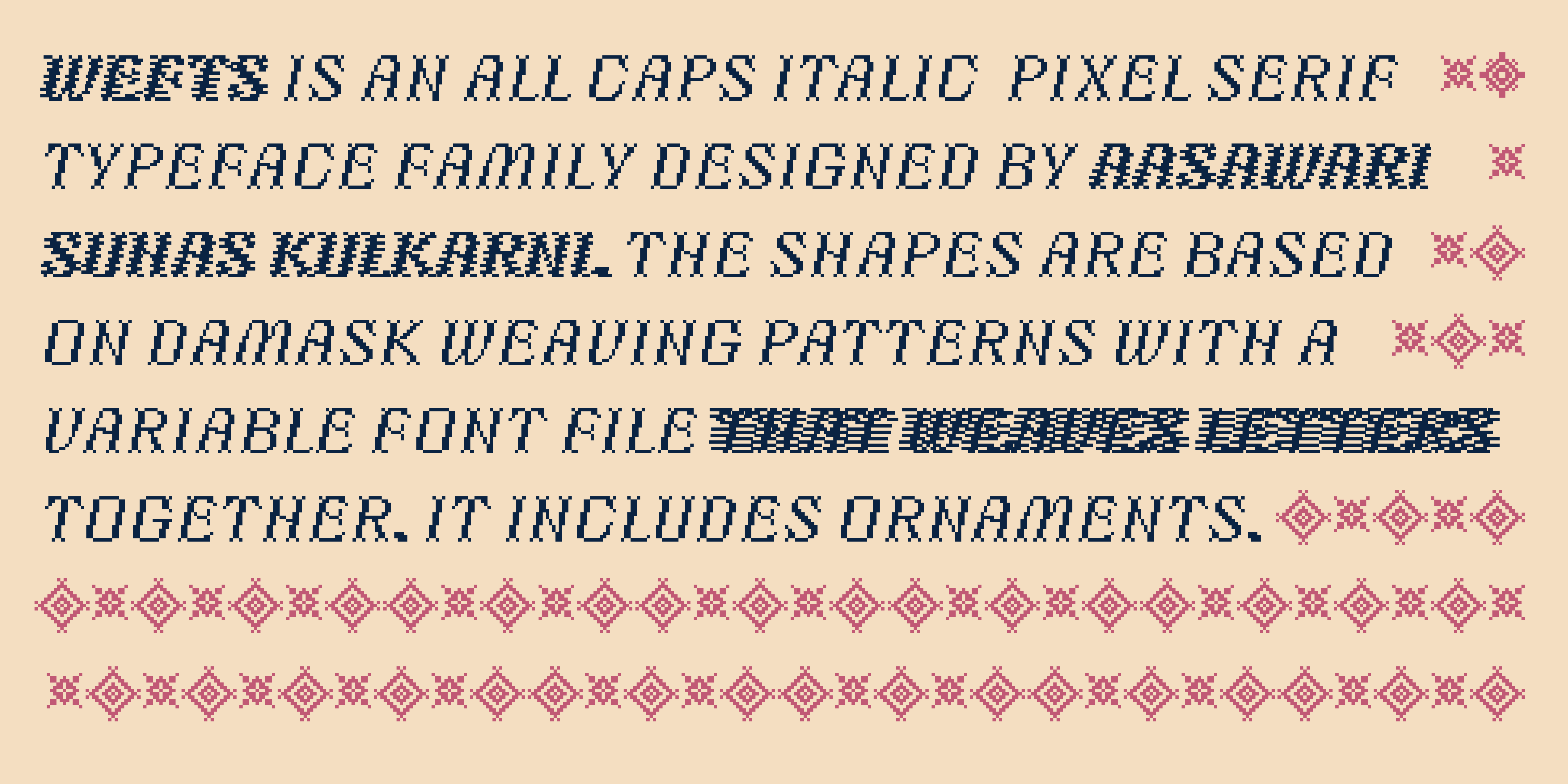 Regular Weaving Woven Ornaments Regular Ornaments Weaving Ornaments WovenWefts is a slanted all-caps typeface designed by Aasawari Kulkarni to simulate the process of weaving by interlapping horizontal strokes. Initially inspired by the pixel-like patterns of the versatile Damask weaving, this variable typeface features a width axis that weaves individual letters in a textured pattern through the process of wefting. The static styles include a 'weaving' weight, a 'woven' weight, and a regular weight, along with a set of ornaments and borders. The furthest end of the axis is fully woven and plays with legibility as a tool to feel more like the texture of weaving rather than readable words. You get the legibility in the Regular–Weaving spectrum, and then it starts breaking down into a woven pattern. This pixel typeface treats modularity as a starting point to warp and weft individual pixels that act as digital threads, but also considers the in-betweens in the process of integration to form weaves. Overlap it, use it for ornamentation, patterns, textures, or for tactility.