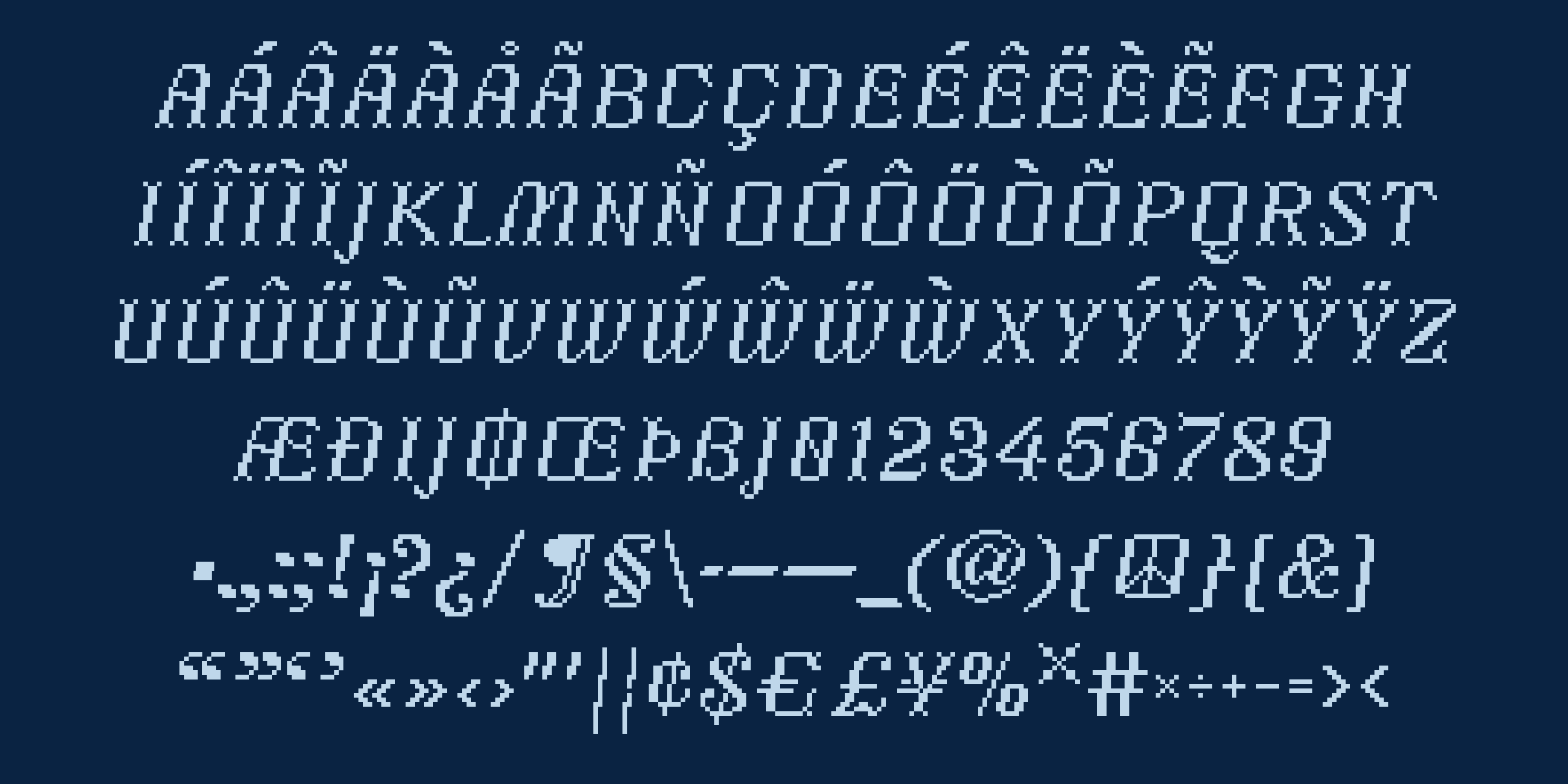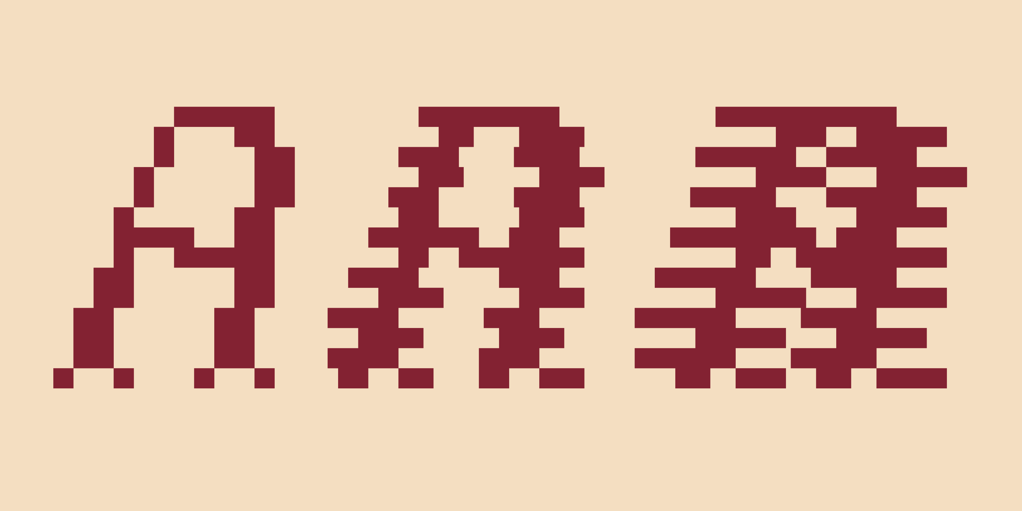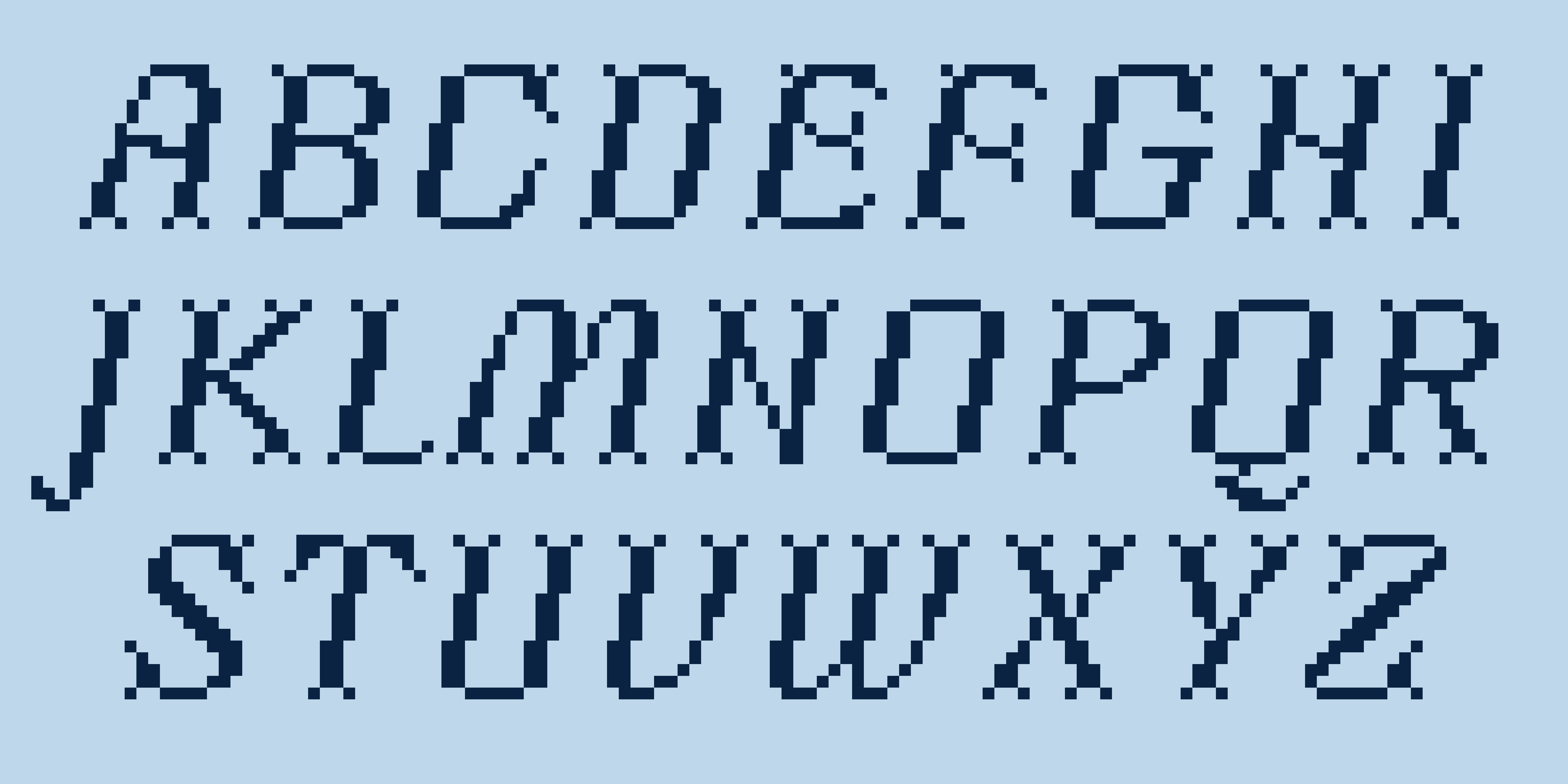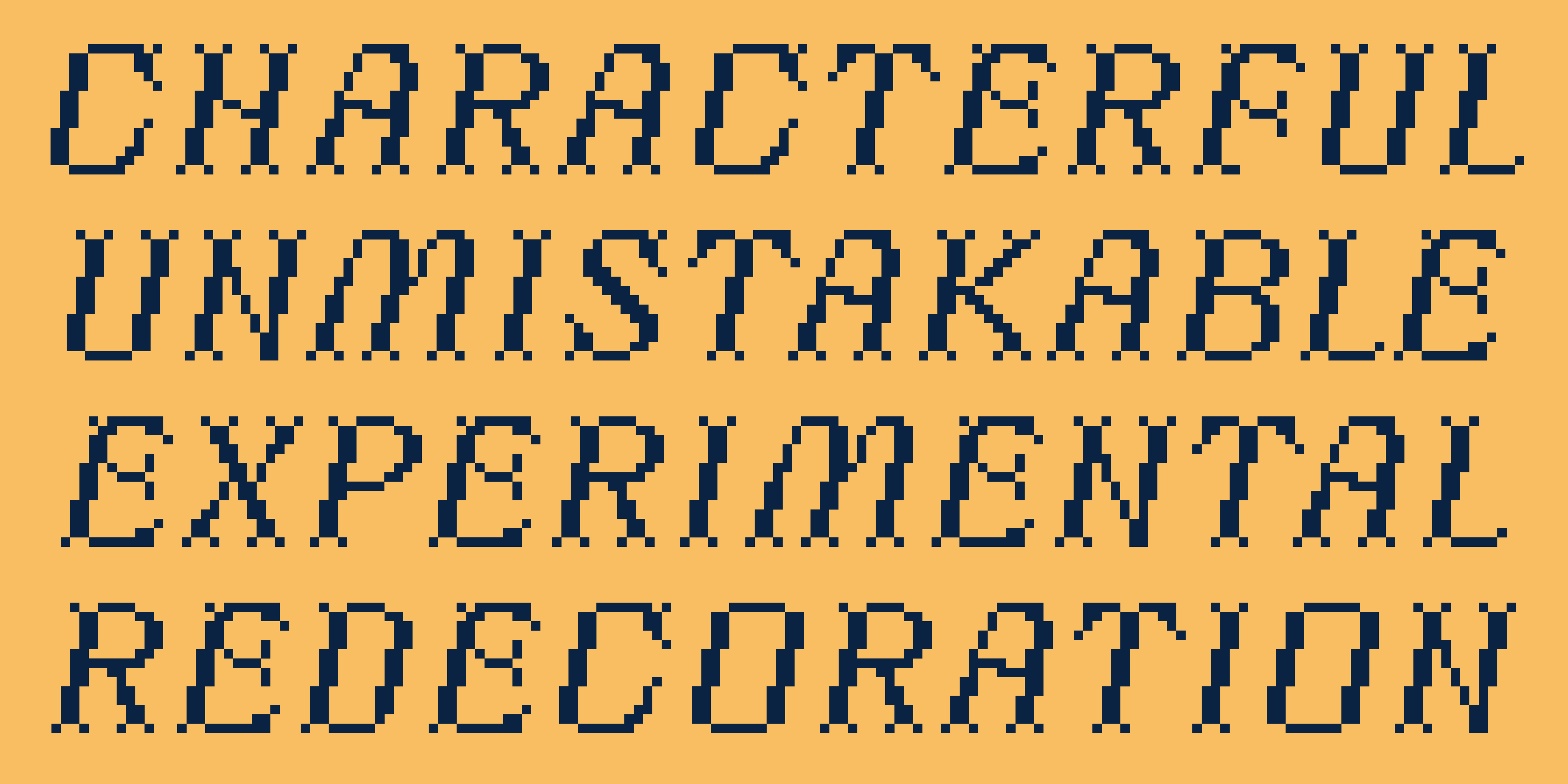 Regular Weaving Woven Ornaments Regular Ornaments Weaving Ornaments WovenWefts is a slanted all-caps typeface designed by Aasawari Kulkarni to simulate the process of weaving by interlapping horizontal strokes. Initially inspired by the pixel-like patterns of the versatile Damask weaving, this variable typeface features a width axis that weaves individual letters in a textured pattern through the process of wefting. The static styles include a 'weaving' weight, a 'woven' weight, and a regular weight, along with a set of ornaments and borders. The furthest end of the axis is fully woven and plays with legibility as a tool to feel more like the texture of weaving rather than readable words. You get the legibility in the Regular–Weaving spectrum, and then it starts breaking down into a woven pattern. This pixel typeface treats modularity as a starting point to warp and weft individual pixels that act as digital threads, but also considers the in-betweens in the process of integration to form weaves. Overlap it, use it for ornamentation, patterns, textures, or for tactility.
